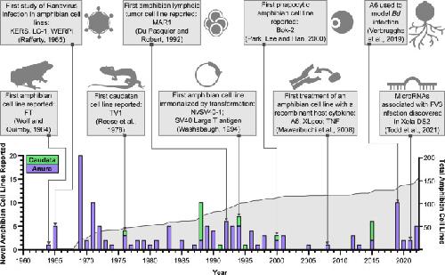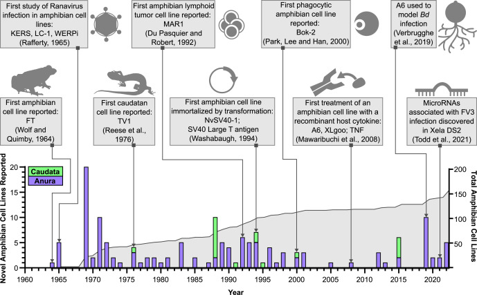 Fig. 1. Timeline of amphibian cell line development and select immunological milestones. Since the development of the first reported amphibian cell line in 1964, over 150 distinct amphibian cell lines have been developed. The number of novel anuran and caudatan cell lines reported, as well as the cumulative number of amphibian cell lines, are given for each year. Amphibian cell lines have been used to study host-pathogen interactions since they were first developed and continue to support our understanding of amphibian immune responses today. Abbreviations: Bd, Batrachochytrium dendrobatidis; FV3, frog virus 3; TNF, tumour necrosis factor.
