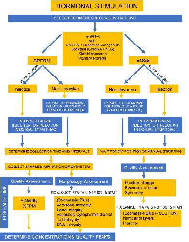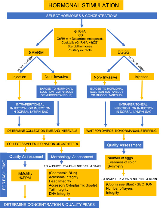 Fig. 1. Recommended steps for the systematic development of hormonal stimulation protocols for amphibian gamete collection. The process includes selection of hormones and concentrations, administration method, gamete collection, quality and morphology assessments, and determination of quality and concentration peaks (only for sperm). Following these steps would result in the nonempirical selection of the best stimulation treatment on the basis of hormone efficacy, gamete quality and concentration. FPM (forward progressive motility), PFA (paraformaldehyde) and NBF (neutral buffered formalin).