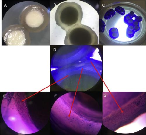 Fig. 2. Morphology assessment of Strabomantis bufoniformis eggs. Freshly laid eggs were collected and fixed in 4% PFA for 24 h, sectioned (A,B), stained with Coomassie Blue for 90 s (C,D) and washed with ARS. Staining revealed three jelly layers (E,F,G) when observed under the microscope (200X) (Della Togna, unpublished). (For interpretation of the references to color in this figure legend, the reader is referred to the Web version of this article.)
