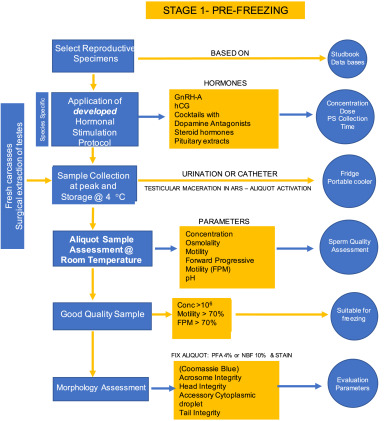 Fig. 3. Steps for the systematic development of sperm pre-freezing assessment. After sample collection, either by hormonal stimulation or testicular excision, samples should be assessed for quality and concentration. Samples yielding concentration and motility parameters equal to or higher than 106 and 70% respectively, should be considered for freezing. PS collection time: poststimulation collection time, FPM (forward progressive motility), PFA (paraformaldehyde) and NBF (neutral buffered formalin).