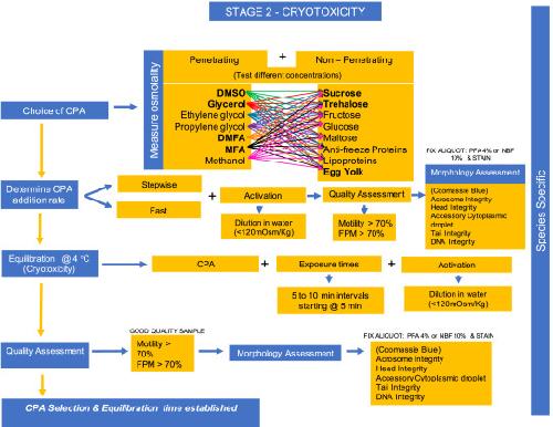 Fig. 4. Steps to determine the cryotoxic effect of CPA’s. Selection of an effective CPA solution for sperm freezing involves choosing the most appropriate penetrating and non-penetrating CPA’s and their concentrations (in bold the most commonly used), addition rate and equilibration time on the basis of sample quality and morphology.