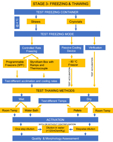 Fig. 5. Recommended steps to determine the most appropriate sperm freezing and thawing conditions. The process requires selection of the freezing container, freezing mode, thawing conditions and sample activation on the basis of post-thaw sperm quality and morphology recovery.