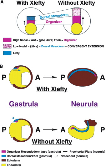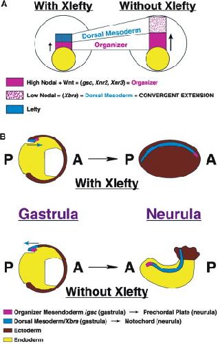 (A) In the absence of Xlefty function, dorsal Nodal- and Wnt-responsive gene expression domains, indicative of the dorsal organizer (gsc, Xnr2, Xnr3) and the presumptive dorsal mesoderm (Xbra), expand toward the animal cap. Vegetal view, with dorsal to the top. Arrows represent the extent of the Nodal/Wnt signaling responses that specify the organizer. (B) (top) Normally by mid-gastrulation, the Xbra-expressing cells of the presumptive dorsal mesoderm have involuted and begun to undergo convergent extension. By the end of neurulation, the convergent extension of dorsal embryonic tissues has resulted in the elongation of the notochord and anterior (A)/posterior (P) axis. (bottom) In the absence of Xlefty function, the dorsal organizer (gsc) and presumptive dorsal mesoderm (Xbra) expand. Furthermore, the expansion of the organizer shifts the presumptive dorsal mesoderm further from the dorsal lip. We propose that this shift prevents or delays the dorsal mesoderm in Xlefty-deficient embryos from involuting by mid-gastrulation, yet the cell-autonomous convergent extension movements of the dorsal mesoderm still initiate normally. Subsequently, an external extension of the noninvoluted dorsal mesoderm results in exogastrulation and an inversion of the A/P axis. The gastrulae are depictions of a sagittal section through the dorsal lip. The neurulae are lateral views. Blue arrows indicate the direction of convergent extension.