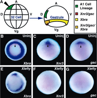 (A) Xlefty RNA (100 pg) was injected into a dorsal left cell of the top tier of a pigmented 32-cell embryo. Coinjection of a lineage tracer confirmed targeting (our unpublished data). A is animal pole, Vg is vegetal pole, D is dorsal, and V is ventral. (BâG) Injected embryos were fixed at stage 10.25â10.5 and examined by in situ hybridization so that the endogenous expression of (B and E) Xbra, (C and F) Xnr3, and (D and G) gsc could be assessed. Vegetal views, with dorsal at the top. Arrowheads indicate the dorsal lip. (BâD) Uninjected embryos displayed normal expression of Xbra ([B], n = 20/20), Xnr3 ([C], n = 19/20), and gsc ([D], n = 10/10). In contrast, injection of Xlefty into the animal cap severely reduced or eliminated the endogenous expression of Xbra ([E], n = 20/20 reduced), Xnr3 ([F], n = 11/20 absent; 9/20 reduced), and gsc ([G], n = 9/10 absent; 1/10 reduced). These results indicate that ectopic Xlefty expression in an ectoderm lineage (green, [A]) can inhibit endogenous Nodal- and Wnt-responsive gene expression in distant mesoderm lineages (red and yellow, [A]).