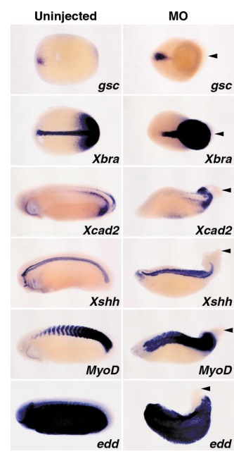 (MO) albino embryos, respectively. gsc and Xbra were examined