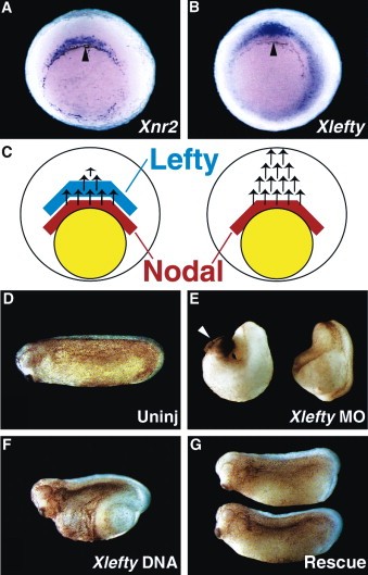Figure 1. Depletion of Xlefty Results in Exogastrulation(A) Xnr2 and (B) Xlefty are dorsally expressed in complementary adjacent domains at stage 10.5. Vegetal views, with dorsal at the top. Arrowheads indicate the dorsal lip. (C) Model of Nodal signaling at the dorsal lip in the presence (left) or absence (right) of Lefty function. Arrows represent the extent of Nodal signaling response away from the dorsal lip; vegetal view. (DâG) Xlefty depletion by MO injection results in exogastrulation that is rescued by coinjection of an Xlefty DNA construct that lacks the MO-targeted sequence. (D) Uninjected embryo (59/60 normal). (E) Exogastrulae from injection of 8 pmol anti-Xlefty MO (49/60 exogastrulated). Complete exogastrula on left, partial exogastrula on right. The arrowhead indicates the pigmented ectoderm at the posterior end (confirmed by in situ hybridization, Supplementary Figure S3) of the complete exogastrula. Complete exogastrulae (24/60) exhibited no morphologically obvious neural plate during neurulation and no dorsal closure after neurulation, whereas partial exogastrulae (25/60) had a morphologically recognizable neural plate and â¤50% dorsal closure over the yolk. (F) Injection of 100 pg CS2+/Xlefty DNA results in aberrant development but not exogastrulation (0/46 exogastrulated). (G) Coinjection of 8 pmol anti-Xlefty MO + 100 pg CS2+/Xlefty DNA rescues gastrulation (1/60 exogastrulated). Post-neurula embryos with neural plate closure and >50% dorsal closure over the yolk were scored as rescued. (D, F, and G) Leftlateral view at stage 26, with anterior to the left. For exogastrulae (E), shown is a dorsal view at stage 26, with anterior at the top.