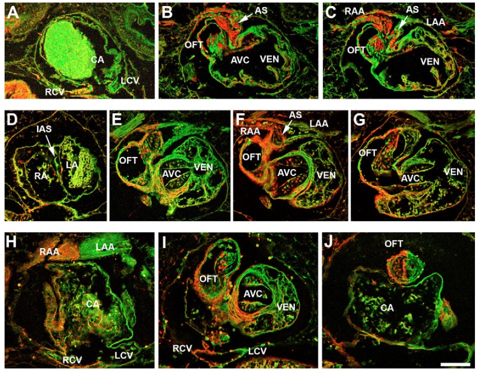 are indicated. The hearts in A-C and H-J each contain