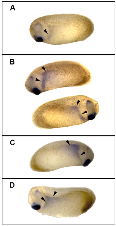 (arrowheads). (A) Control embryo, left-side view. (B) Right-side injected