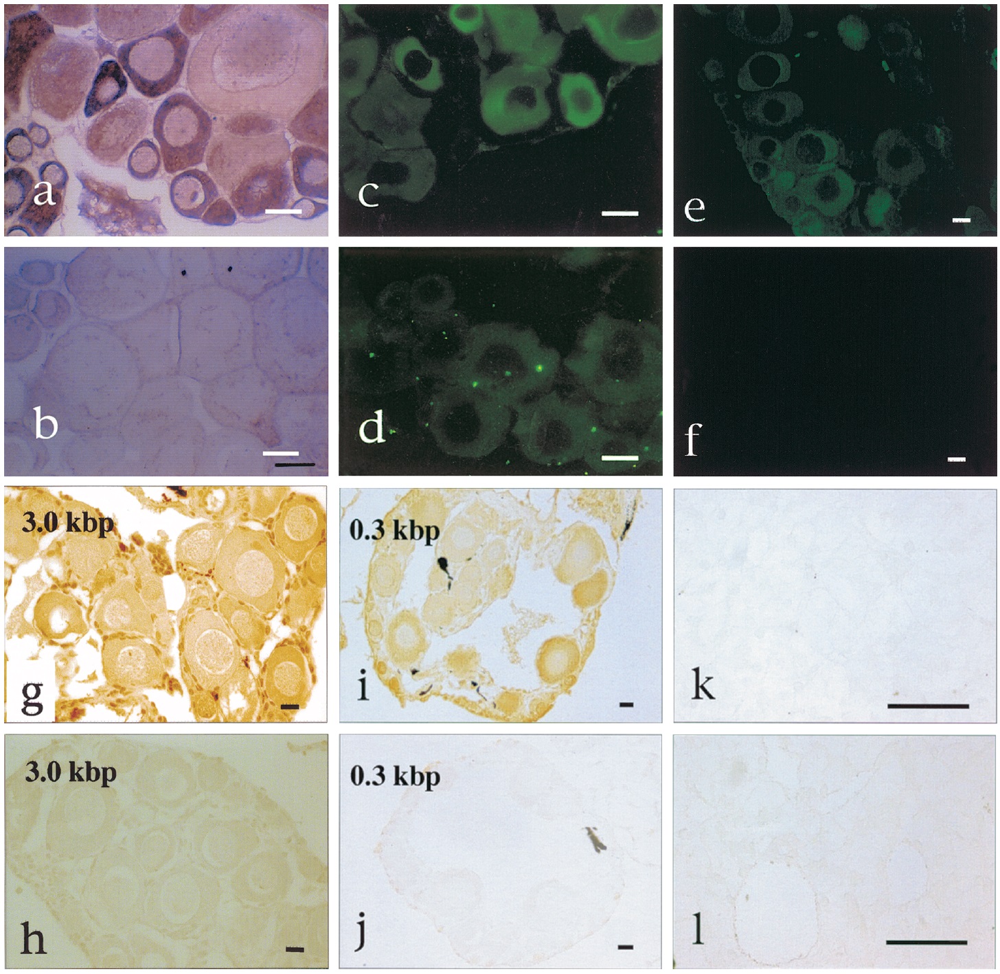 and 0.3 (i,j) kb 5-flanking regions of the FTZ-F1 gene. Sections of Xenopus ovaries were photographed under fluorescent illumination