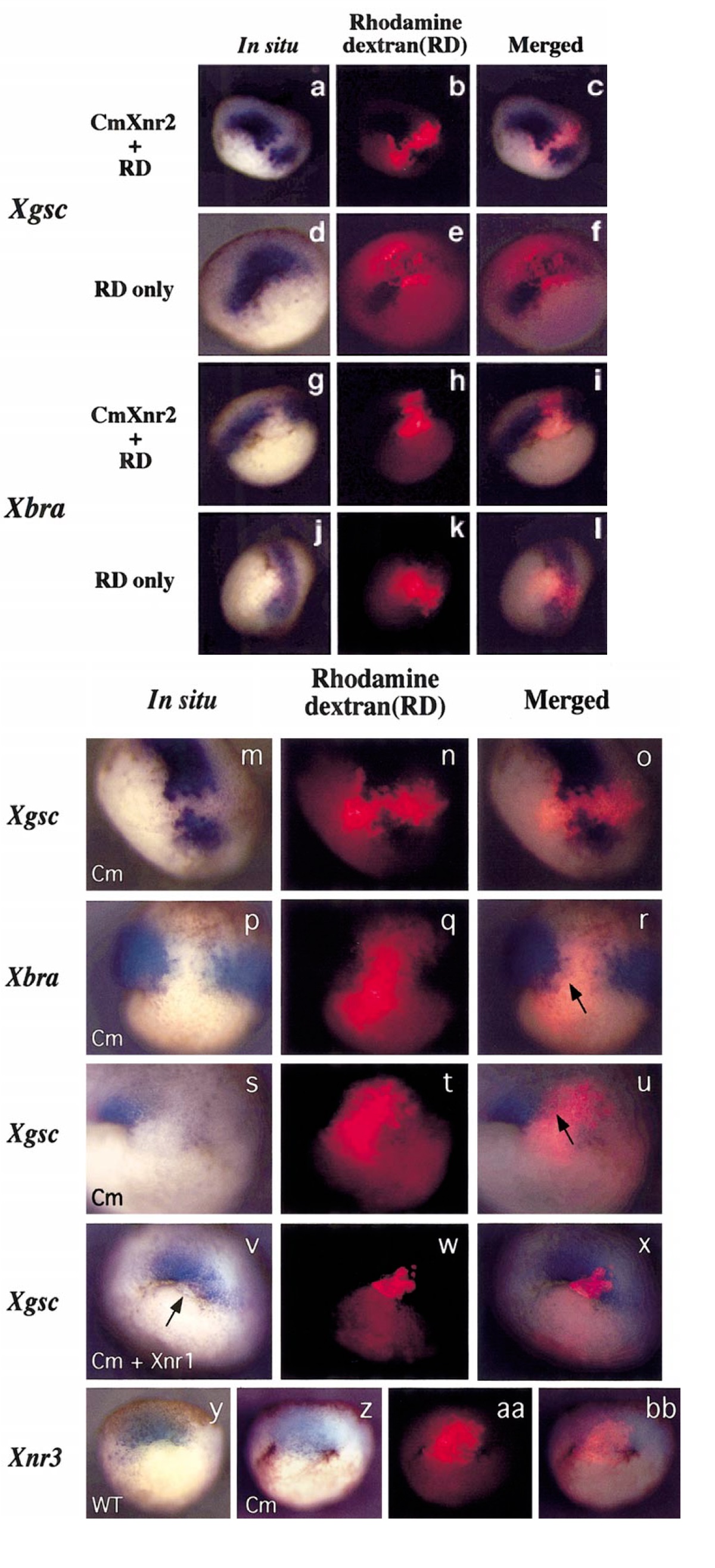 rhodamine dextran only (dâf and jâl). All embryos injected with CmXnr2 mRNA disrupted either Xbra (n 100) or Xgsc (n 50) expression.