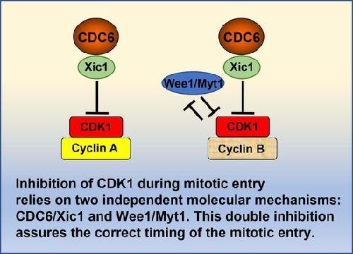 Timely mitosis is critically important for early embryo development. It is regulated by the activity of the conserved protein kinase CDK1. The dynamics of CDK1 activation must be precisely controlled to assure physiologic and timely entry into mitosis. Recently, a known S-phase regulator CDC6 emerged as a key player in mitotic CDK1 activation cascade in early embryonic divisions, operating together with Xic1 as a CDK1 inhibitor upstream of the Aurora A and PLK1, both CDK1 activators. Herein, we review the molecular mechanisms that underlie the control of mitotic timing, with special emphasis on how CDC6/Xic1 function impacts CDK1 regulatory network in the Xenopus system. We focus on the presence of two independent mechanisms inhibiting the dynamics of CDK1 activation, namely Wee1/Myt1- and CDC6/Xic1-dependent, and how they cooperate with CDK1-activating mechanisms. As a result, we propose a comprehensive model integrating CDC6/Xic1-dependent inhibition into the CDK1-activation cascade. The physiological dynamics of CDK1 activation appear to be controlled by the system of multiple inhibitors and activators, and their integrated modulation ensures concomitantly both the robustness and certain flexibility of the control of this process. Identification of multiple activators and inhibitors of CDK1 upon M-phase entry allows for a better understanding of why cells divide at a specific time and how the pathways involved in the timely regulation of cell division are all integrated to precisely tune the control of mitotic events.