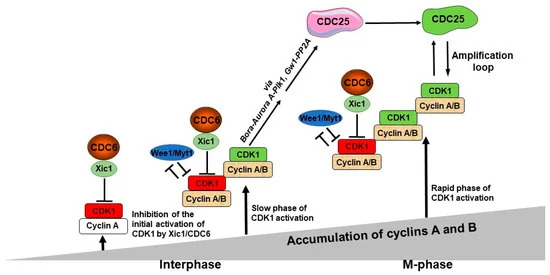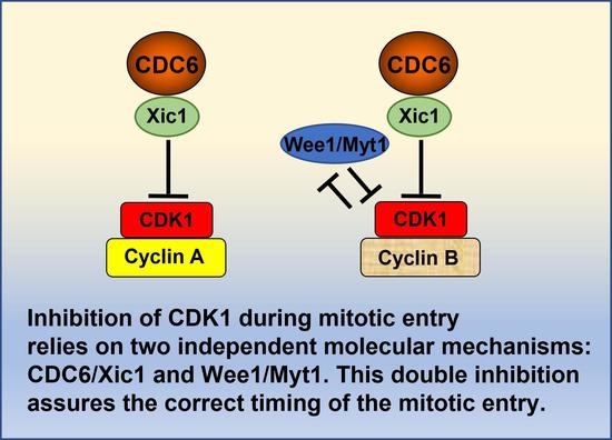Figure 2. A model of the role of CDC6 in the control of the M-phase entry. The first, potentially active CDK1 molecules start to appear after the cyclin A level reaches a predetermined threshold, but they are actively inhibited by CDC6/Xic1. The first active CDK1/cyclin A molecules appear when they escape from CDC6-dependent inhibition, while CDK1/cyclin B complexes are inhibited by both CDC6/Xic1- and Wee1/Myt1-dependent mechanisms. This is the step of the initial activation of CDK1. In parallel, both cyclin A and B levels continue to increase with time and keep associating with CDK1. The active CDK1/cyclin A and CDK1/cyclin B complexes become more abundant, and they, or only CDK1/cyclin B, become able to phosphorylate its substrates—Bora and Gw1. Due to this activation of Plk1 via these two distinct pathways, the procedure is highly effective, which in turn promotes CDC25 activity acting as the CDK1 amplification loop. |