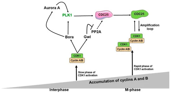 Figure 1. A regulatory network between CDK1, Bora-Aurora A, Plk1, Gw1-PP2A, and CDC25 upon mitotic entry. Before mitosis, CDK1 is activated when cyclins A and B reach a threshold concentration. The mitotic cyclin-associated CDK1 phosphorylates the Bora protein, activating Plk1. Additionally, Bora and Aurora A kinase interact to stimulate Plk1 activity. Parallel to this, CDK1 stimulates Gw1 activity, which inhibits PP2A (Protein Phosphatase 2A) and promotes the activation of CDC25. This activates CDK1’s amplification loop, which blocks PP2A via Gw1 and effectively activates Plk1 by Bora-Aurora A. As a result, the regulatory network between all these proteins controls the time when CDK1 amplification becomes fully activated, and how the mitosis progresses after that. |