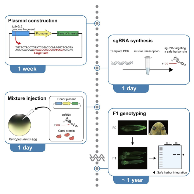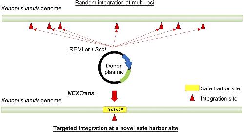 Figure 2. Schematic representation of NEXTrans (New and Easy Xenopus Transgenesis) at a novel harbor site