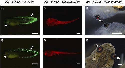 Figure 5. Germline transmission of transgenic X. laevis generated by NEXTransRepresentative photographs of F1 offspring of (A) Xla.Tg(NEXT-fgk:egfp), (B) Xla.Tg(NEXT-cmv:tdtomato), and (C) Xla.Tg(NEXT-cryga:tdtomato) embryos. Arrowheads indicate the gill; double arrowheads indicate the edge of the tail fin; arrow indicates the eye with tdTomato signal. Scale bars = 1 mm. |