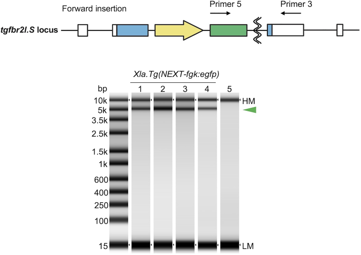 Figure 4. Representative PCR genotyping for targeted integration of NEXTrans plasmidPCR genotyping was performed using the primer pairs described in Figure 2 and key resources table to detect Tg(NEXT-fgk:egfp) integration in tgfbr2l loci. The genomic DNA was extracted from F1 siblings (#2) generated by in vitro fertilization. Green arrowhead indicates expected PCR products, suggesting Tg(NEXT-fgk:egfp) was integrated into the tgfbr2l.S locus in the forward direction. Samples 1–4, strong eGFP signals were detected in the gill and the edge of the tail fin; sample 5, wild-type (WT) tadpole. HM, high molecular weight marker; LM, low molecular weight marker in the TapeStation electropherogram. |