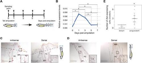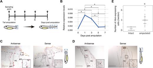Fig. 1. rfem.L and rfem.S expression is upregulated after tail amputation and is detected in scattered cells in the amputated tails. (A) Experimental design of expression analysis. Tail stumps (0 dpa) and regenerating tails (1 to 7 dpa) were sampled at the time-points indicated with arrows. (B) Relative expression levels of rfem.L and rfem.S in the tail stumps/regenerating tails. Vertical axes represent relative expression of rfem.L and rfem.S normalized to that of ef1a. Data are mean±s.d., n=4. *P<0.05, Tukey-Kramer's test. (C,D) Representative images of in situ hybridization of rfem.L and rfem.S with (left) the antisense probe and (right) the sense probe on sagittal sections of tails from (C) 3 dpa or (D) intact tadpoles. Posterior is upwards and dorsal is leftwards. Red arrowheads indicate representative signals. Black dashed lines indicate the amputation position. Areas enclosed with orange dashed lines in C indicate the regeneration buds. Insets in the figures are magnified images of the outlined areas. Blue dashed lines in the schematic diagrams outline the location of the sections. nc, notochord; sm, skeletal muscle. Scale bars: 200 μm. (E) Number of rfem-expressing cells in sections of intact (28 sections from nine tadpoles) or 1 dpa (24 sections from nine tadpoles) tails. Data are mean±s.d., *P<0.05, Welch's t-test. |