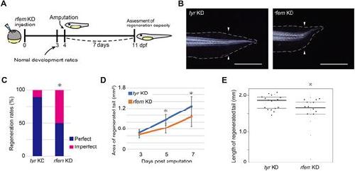 Fig. 2. rfem.L and/or rfem.S are required for normal tail regeneration. (A) Experimental design of rfem.L and rfem.S KD. (B) Representative images of regenerated tails at 7 dpa in tadpoles from tyr KD, and rfem.L and rfem.S KD groups. Gray dashed lines indicate the outline of the tail. Arrowheads indicate amputation sites. Scale bars: 2 mm. Other examples of regenerated tails are shown in Fig. S2D. (C) Regeneration rates of tyr KD (n=18), and rfem.L and rfem.S KD (n=18) groups. Tadpoles from each experimental group were classified into two groups depending on the morphology of the regenerated tails: perfect or imperfect (see Materials and Methods). *P<0.05 versus tyr KD, Fisher's exact test. Data are representative of three experiments; the other results are shown in Fig. S2E. (D,E) Measured (D) area and (E) length of regenerated tails at (D) 3, 5 and 7 dpa, and (E) 7 dpa in tyr KD (n=18), and rfem.L and rfem.S KD (n=18) groups. Data are mean±s.d. in D. In E, the horizontal lines indicate the 25th, 50th and 75th percentiles. Other results are shown in Fig. S2F,G.*P<0.05, Welch's t-test. |
