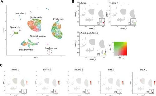 Fig. 3. rfem.L and rfem.S are expressed in a subset of leukocytes with a macrophage-like gene expression profile. (A) UMAP plot of cells detected in the scRNA-seq. Cells from the tail tips and tail stumps from intact tadpoles, and the regeneration bud at 2 dpa in tadpoles are plotted together and divided into 50 clusters shown in different colors. (B) rfem.L and rfem.S expression on a UMAP plot. (Upper left) rfem.L and (upper right) rfem.S expression are plotted using red and green dots, respectively. (Lower) Expression of rfem.L and rfem.S is shown by merged colors. Insets in each plot are magnified images of the leukocyte clusters, which are outlined in the plots. Black arrowheads indicate the fraction of the rfem.L- and rfem.S-expressing cells. (C) Genes with enriched expression in the rfem.L- and rfem.S-expressing cells. |