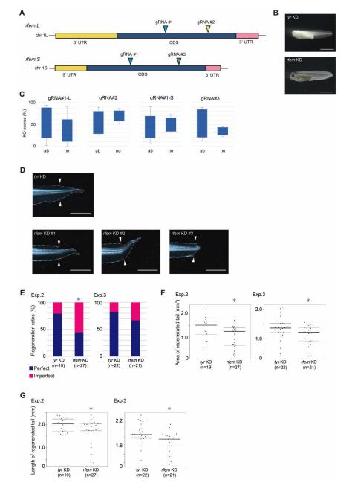 Fig. S2. rfem is not essential for development, but is required for normal tail regeneration. (A) Target sites of guide RNAs used for KD of rfem are indicated by the arrowheads. gRNA#1 targets common sequences in the rfem.L and rfem.S genes. There are no introns within the rfem.L/S genes. (B) Representative images of normally developed 4 dpf tadpoles from the tyr KD and rfem KD groups. Scale bars: 2 mm. (C) Box plots of KO scores for the gRNA #1, #2, and #3 target sites in rfem.L and rfem.S estimated using genomic DNA extracted from the whole body of each rfem KD tadpole with abnormal morphology (ab, n=5) or normal morphology (no, n=5) at 3 days after fertilization. No significant differences were detected using Welch's t test. (D) Other examples of abnormal tail regeneration observed in the rfem KD group. Gray dashed line shows the outline of the tail. Arrowheads indicate amputation site. Scale bars: 2 mm. (E) Regeneration rates of the tyr KD and rfem KD groups. Development: doi:10.1242/dev.200467: Supplementary information Development • Supplementary information Tadpoles from each experimental group were classified into 2 groups depending on the morphology of the regenerated tails: perfect or imperfect (see Methods). Three experiments, including those for which the results are shown in Fig. 2C, were performed independently. The numbers of individuals in each experimental group are indicated below each graph. *P< 0.05 versus tyr KD, Fisher’s exact test. (F, G) Measured (F) area and (G) length of regenerated tails at 7 dpa. Three experiments, including those for which the results are shown in Fig. 2D and 2E, were performed independently. The horizontal lines indicate the 25th, 50th, and 75th percentiles.*P < 0.05, Welch's t test. (H) Measured area of skeletal muscle and notochord in regenerated tail from tadpoles in the tyr KD and rfem KD groups at 7 days after amputation. The data for the first experiment are from the experiment shown in Fig. 2D. The horizontal lines indicate the 25th, 50th, and 75th percentiles.*P < 0.05, Welch's t test. (I) Scatter plots of measured area of regenerated tail at 7 days after amputation (horizontal axis) and KO scores at each gRNA target site estimated using genomic DNA extracted from blood cells (vertical axis) of rfem KD tadpoles. gRNA#1-L and gRNA#1-S represent the gRNA #1 target site in rfem.L and rfem.S, respectively. n=8-10. No correlation was detected between the 2 parameters. (J) Representative images of rfem KD tadpoles showing (left) imperfect regeneration at 7 days after amputation, and (right) the same individual at 1 month after amputation. We traced the regeneration outcomes of 3 rfem KD tadpoles showing imperfect regeneration for 1 to 2 months, and observed that the morphology remained imperfect in all of them. Gray dashed line shows the outline of the tail. Scale bars: 2 mm. (K) Representative images of regenerated tail at 7 days after the second amputation in tadpoles that had been amputated twice (at 4 days after fertilization and at 1 to 2 months after the first amputation). We performed this experiment using 3 rfem KD tadpoles showing imperfect regeneration after the first amputation and 7 tyr KD tadpoles, and observed that the 3 rfem KD tadpoles also showed imperfect regeneration after the second amputation, in contrast to the result of the 6 tyr KD tadpoles which showed perfect regeneration. Scale bars: 2 mm. |