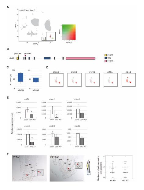 Fig. S4. KD of csf1 impaired tail regeneration. (A) Expression of csf1r.S and rfem.L is plotted in red and green, respectively. Co-expressing cells are plotted in yellow. (B) Target sites of guide RNAs used for KD of csf1 are indicated by the arrowheads. (C) Box plots of KO scores of the gRNA #4 and #5 target site in csf1.S estimated using genomic DNA extracted from the amputated tail of each csf1 KD tadpole. n=8. (D) Expression of genes indicated on the plots in the leukocyte cluster are plotted in red. (E) Relative expression levels of genes indicated on the graphs in the tail stumps at 24 h after amputation in tadpoles from cas9 and csf1 KD groups. Vertical axes represent relative expression levels normalized by those of ef1α. Mean ± s.d, n = 3. *P<0.05, Welch's t test. (F) (Left) Representative images of in situ hybridization of c1qa.L on sagittal sections of tails from 1 dpa tyr KD and csf1 KD tadpoles. Red arrowheads indicate signals. Insets in the figures are magnified images of the boxed areas. Boxes with blue dashed lines in the schematic Development: doi:10.1242/dev.200467: Supplementary information Development • Supplementary information diagrams indicate the location of the sections. nc, notochord; sc, spinal cord; sm, skeletal muscle. Scale bars: 200 μm. (Right) Number of c1qa.L-expressing cells in sections of 1 dpa tails of tyr KD (29 sections from 14 individuals) or csf1 KD (34 sections from 12 individuals) tadpoles. Mean ± s.d., not significant in Welch's t test. (G) Examples of abnormal tail regeneration observed in the csf1 KD group. Gray dashed line shows the outline of the tail. Arrowheads indicate amputation site. Scale bars: 2 mm. (H) Regeneration rates of cas9 and csf1 KD groups. Tadpoles from each experimental group were classified into 2 groups depending on the morphology of the regenerated tails: perfect or imperfect (see Methods). Six experiments (Exp. 1 to 6) were performed independently. The numbers of individuals in each experimental group are indicated below each graph. *P< 0.05 versus cas9, Fisher’s exact test. (I) Schematic drawing of the rescue construct. (Upper) rfem.L coding sequence joined to P2A and acgfp1 coding sequence was placed downstream of the zebrafish mpeg1 promoter, which was flanked by 2 I-SceI sites (mpeg1:rfem). To prevent gene editing of the rescue construct, synonymous substitutions were introduced into the rfem.L sequence at the gRNA#1 and #2 target sites. (Lower) A control construct having only the acgfp1 coding sequence downstream of the mpeg1 promoter (mpeg1:gfp). (J) Representative images of GFP-expressing cells in regenerated tails at 1 dpa in rfem KD tadpoles co-injected with the mpeg1:gfp (control). Gray dashed lines indicate the outline of the tail. Scale bars: 500 µm. (K and L) Measured area and length of regenerated tails at 7 dpa in control and rfem-rescued groups. The numbers of individuals in each experimental group are indicated below each graph. The horizontal lines indicate the 25th, 50th, and 75th percentiles, respectively. *P < 0.05, Welch's t test. |