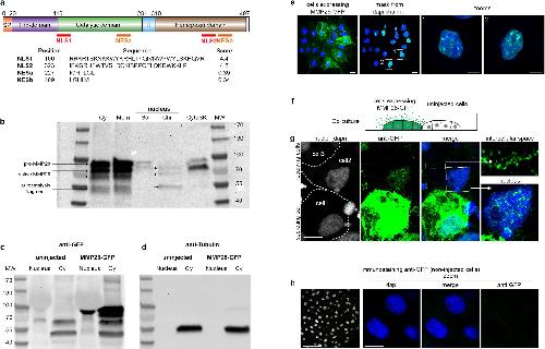 Fig 4. MMP28 can be imported in the nucleus in a paracrine manner. (a) Diagram of MMP28 protein structure and relative position, sequence and score of the putative NLS and NES signals identified by bioinformatics (see Materials and methods). SP, signal peptide; H, hinge region. (b) Western blot against GFP after cell fractionation from embryos expressing MMP28-GFP; Cy, cytosol; Mem, membrane; Sol, soluble nuclear fraction; Chr, chromatin-bound nuclear fraction; CytoSK, cytoskeleton fraction; MW, molecular weight. (c, d) Western bots against GFP (c) and tubulin (d) on nuclear and cytosolic fractions. (e) Neural crest explant expressing MMP28-GFP (green), counterstained with DAPI (blue) observed by 3D confocal imaging, scale bar, 10 μm, dash line squares indicate zoomed areas. (f) Diagram depicting the co-culture assay. (g) Control Xenopus neural crest cells and neural crest cells expressing MMP28-GFP co-cultured on Fibronectin, immunostained with anti-GFP antibody (green) and counterstained with DAPI (blue), representative images from 2 independent experiments with 6 explants, scale bar, 10 μm. (h) Immunostaining against GFP on non-injected cells. Raw images of gels and blots can be found in the S1 Raw Images file. MMP, matrix metalloproteinase; NES, nuclear export signal; NLS, nuclear localization signal. |