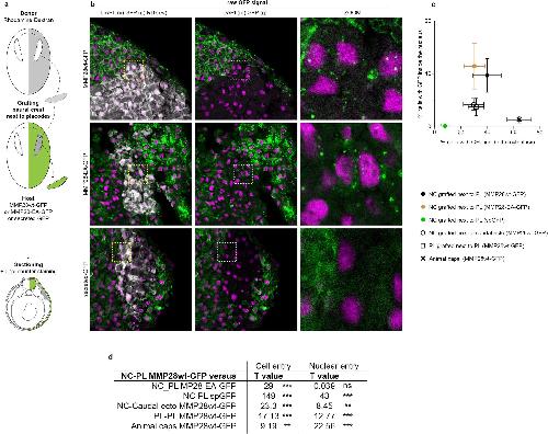 Fig 5. MMP28 can travel from the ectoderm to the nucleus of neural crest cells in vivo. (a) Diagram depicting the grafting procedure and sample preparation. Neural crest from a donor embryo labelled with rhodamine-dextran (grey) were grafted into a host embryo expressing MMP28wt-GFP, MMP28-EA-GFP, or secreted-GFP (green) in the ectoderm and processed for imaging. (b) Representative 1 μm-thick optical sections through the grafted area by confocal microscopy for each condition counterstained with DAPI (magenta), scale bar, 100 μm. Dash line squares indicate zoomed areas, scale bar for zooms 10 μm. No anti-GFP immunostaining was performed on these samples. (c, d) Quantification of cell internalisation and nuclear detection of MMP28-GFP in each grafted conditions shown in panels Figs 5a and 5b and S7. NC-PL MMP28wt-GFP 4 grafts, 452 cells; NC-PL MMP28-EA-GFP 2 grafts, 398 cells; NC-PL sp-GFP 4 grafts, 419 cells; NC-caudal ectoderm 7 grafts, 419 cells; PL-PL-MMP28wt-GFP 5 grafts, 259 cells; animal caps 7 sandwiches, 283 cells. Percentages of GFP-positive cells and nuclei were calculated per embryos. Means and standard deviation are plotted per experimental condition. Statistical analyses (d) comparing the proportions of cells with internal/nuclear GFP signal between NC-PL MMP28wt-GFP condition and the other conditions using contingency tables (see Materials and methods). Numerical data from all graphs can be found in the supporting S1 Data file. MMP, matrix metalloproteinase; NC, neural crest; PL, placodes. |