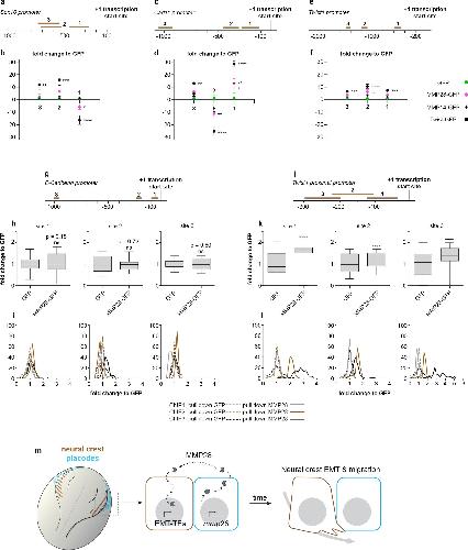 Fig 7. MMP28 interacts with some domains of cadherin-11 and twist promoters. (a–f) ChIP-PCR after ChIP with GFP (green dots), MMP28-GFP (magenta dots), MMP14-GFP (black crosses), and Twist-GFP (black dots) for 3 domains on the sox10 (a, b), cadherin-11 (c, d), and twist (e, f) promoters, normalised to signals in GFP pull down. From 3 technical replicates, mean band intensity from gels are plotted, error bars represent the standard error of the mean. Original uncropped gels used for quantification are provided in S9 Fig. (g–l) ChIP-PCR after ChIP with GFP or MMP28-GFP for 3 domains on the e-cadherin (g–i) or twist (j–l) promoters, normalised to signals in GFP pull down. From 3 independent ChIP assays (biological replicates). Mean pixels intensity from histogram analyses from gels are shown as box and whiskers plots (h, k) or as frequency distribution per ChIP (i, l). Original uncropped gels used for quantification are provided in S12 Fig. (m) Diagram of a dorsal view of a Xenopus embryo with neural crest in brown and placodes in cyan. MMP28 from placodes is imported into neural crest’s nuclei to promote EMT. Numerical data from all graphs can be found in the supporting S1 Data file. ChIP, chromatin immunoprecipitation; EMT, epithelial–mesenchymal transition; MMP, matrix metalloproteinase. |