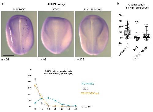 S3 Fig. MMP28 loss-of-function does not lead to cell death in the neural crest domain. (a) Representative images of a TUNEL assay in embryos injected with 10 ng of Morpholino against Sf3b4 (used as a positive control for induction of cell death, see Materials and methods), 4 ng of control MO or 4 ng of MMP28spl-MO in 2 blastomeres at 8-cell stage. (b) Differences between the number of TUNEL dots on each side within the neural crest region. The neural crest region was defined as the lateral half of each anterior neural fold. A value of 0 means that each side had the same number of TUNEL dots on either side. A negative value indicates more cell death on the non-injected side than the injected side while a positive value indicates more cell death on the injected side. (c) Frequency distribution of TUNEL dots in the neural crest region on the injected side in all conditions. Respectively 96% and 94% of all embryos injected with CMO or MMP28spl-MO only had between 0 and 20 TUNEL dots in the injected neural crest region, the remaining 4/6% had more than 20 TUNEL dots. By contrast, after inhibition of Sf3b4, only 37% of embryos had between 0 and 20 TUNEL dots in injected neural crest cells, 47% had more than 20 dots, and the remaining 8% had 30 dots or more on the injected side. ANOVA, Kruskal–Wallis; **** p < 0.0001. |