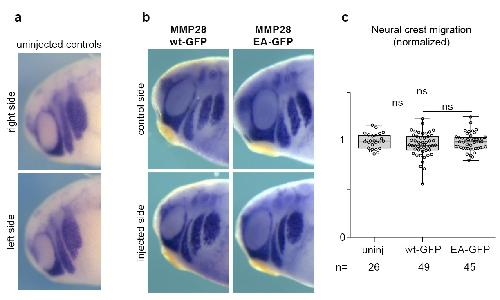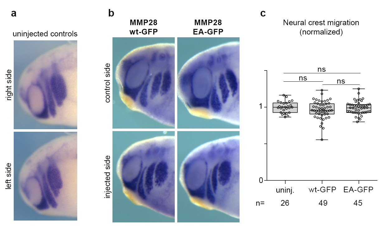 S4 Fig. In vivo overexpression of MMP28wt-GFP and MMP28-EA-GFP. (a, b) In situ hybridization for Twist in uninjected embryos (a) and embryos injected with 900 pg MMP28wt-GFP or MMP28-EA-GFP mRNA (b). (c) Mean dorsoventral migration of neural crest cells in uninjected controls or after MMP28 overexpression, normalised to control side. ANOVA, followed by multiple comparisons. Uninjected vs. MMP28wt-GFP, p = 0.132 (ns); uninjected vs. MMP28-EA-GFP, p = 0.699 (ns); MMP28wt-GFP vs. MMP28-EA-GFP, p = 0.189 (ns). Note that MMP28 overexpression does not affect neural crest migration and does not induce ectopic Twist expression. |