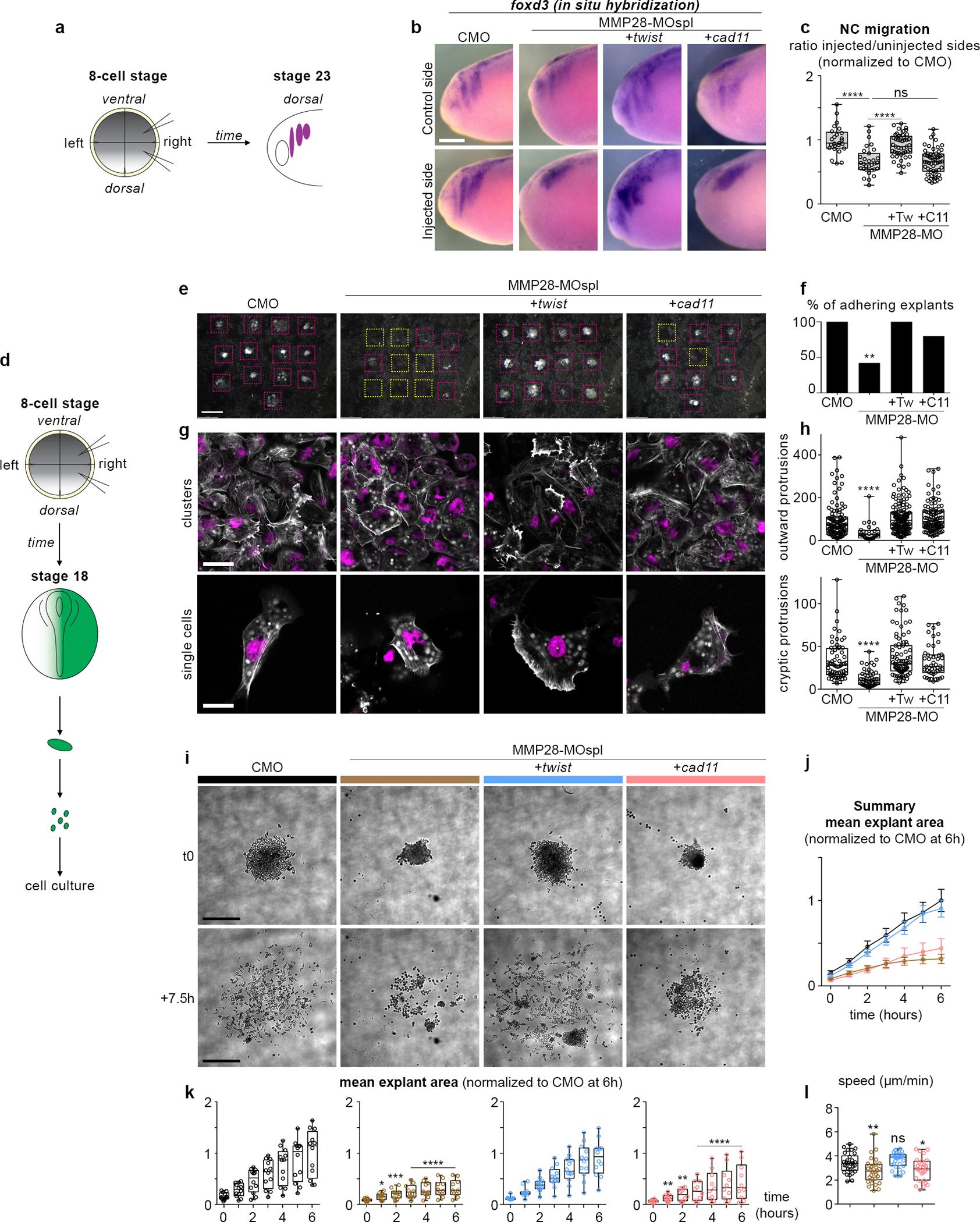 Fig 3. Twist expression is sufficient to rescue adhesion and migration of neural crest cells after MMP28 knockdown. (a) Diagram depicting the experimental set-up with injection of MO and mRNA in 2 blastomeres on one side of 8-cell stage embryos and the embryos analysed at neural crest migration stage (stage 23). (b) In situ hybridization against foxd3 following injection with CMO, MMP28-MOspl, or the co-injection of MMP28-MOspl together with twist or cadherin-11 mRNA. (c) Graph plotting the distance migrated by neural crest cells in the experimental conditions shown in (b), nCMO = 25, nMMP28-MOspl = 31 nMMP28-MOspl+twist = 57, nMMP28-MOspl+cad11 = 47 from 2 independent experiments. ANOVA followed by uncorrected Fisher’s LSD; ****, p < 0.0001, ns, p = 0.8829. (d) Diagram depicting the experimental procedure for neural crest culture on Fibronectin. (e) Low magnification images of explants in all experimental conditions after fixation. Adhering explants are outlined in purple, detached explants are outlined in yellow; scale bar, 500 μm. (f) Quantification of adhering explants, CMO = 13/13; MMP28-MOspl = 5/13; MMP28-MOspl+twist = 12/12; MO28-MOspl+cad11 = 8/10. Contingency tables for the comparison of proportion; CMO vs. MMP28-MOspl, T = 10.53, alpha 0.01 (**), MMP28-MOspl vs. MMP28-MOspl+twist, T = 9.88, alpha 0.01 (**), MMP28-MOspl vs. MMP28-MOspl+cad11, T = 3.31 (ns), CMO vs. MMP28-MOspl+cad11, T = 2.85, (ns). (g) DAPI (magenta) and Phalloidin (white) staining; scale bars, 40 μm for clusters, 20 μm for single cells. (h) Protrusion area in μm2, outward protrusions CMO (n = 64), MMP28-MOspl (n = 49), MOspl+twist (n = 47), MOspl+cad11 (n = 87); cryptic protrusions CMO (n = 103), MMP28-MOspl (n = 29), MOspl+twist (n = 140), MOspl+Cad11 (n = 100); ANOVA, Kruskal–Wallis test; ****, p < 0.0001. (i) Time-lapse imaging of neural crest explants, scale bar, 250 μm. (j) Summary graph with curves showing the mean area and standard deviation per experimental condition shown in (i) per time point. (j, k) Mean explant area + SD per explant per conditions shown in (i) per time point, CMO (n = 12), MMP28-MOspl (n = 10), MOspl+twist (n = 12), MOspl+cad11 (n = 10). (l) Speed of individual cells (μm/min) from each experimental conditions shown in panels (i–k); CMO (n = 30), MMP28-MOspl (n = 30), MOspl+twist (n = 32), MOspl+cad11 (n = 28). ANOVA followed by multiple comparisons; CMO vs. MOspl p = 0.0057 (**), CMO vs. MOspl+cadherin11 p = 0.0291 (*), CMO vs. MOspl+twist p = 0.2483 (ns). Numerical data from all graphs can be found in the supporting S1 Data file. CMO, control Morpholino; MMP, matrix metalloproteinase. |