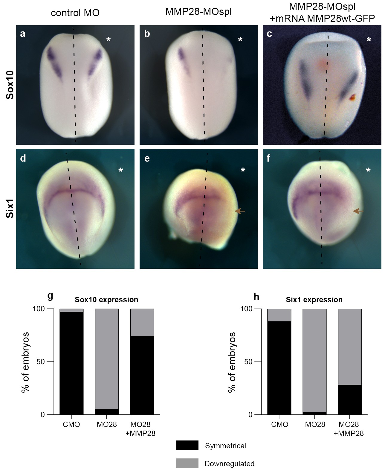 S5 Fig. Rescue of Sox10 expression can occur in absence of a rescue of Six1 expression. (a–f) In situ hybridization for Sox10 (a–c) and Six1 (d–f), in embryos injected with CMO (a, n = 29; d, n = 56), MMP28-MOspl (b, n = 40; e, n = 43), or co-injected with MMP28-MOspl and mRNA for MMP28wt-GFP (c, n = 31; f, n = 41). (g, h) Proportions of embryos with symmetrical or decreased expression of Sox10 (g) or Six1 (h) in each experimental condition. Contingency tables for comparison of proportions: Sox10 CMO vs. MOspl, T = 57.34 (***), MOspl vs. rescue condition, T = 36.65 (***); Six1 CMO vs. MOspl, T = 70.59 (***), MOspl vs. rescue condition, T = 7.7 (***), Rescue Sox10 vs. Rescue Six1, T = 19.5 (***). Asterisks on images indicate the injected side. Dotted lines mark the midline of each embryo. Brown arrows indicate the missing portion of Six1 expression domain in MMP28-MOspl and MMP28-MOspl+mRNA MMP28wt-GFP embryos. Scale, embryos are 500 μm wide on average. |