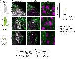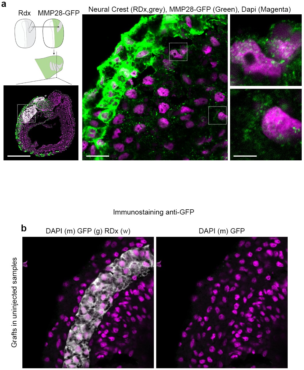 S6 Fig. MMP28 can traffic from the ectoderm to the nuclei of neural crest cells in vivo. (a) Immunostaining against-GFP on cryosections of embryos expression MMP28wt-GFP in which rhodamine-dextran (RDx) positive control neural crest cells were grafted. (b) Immunostaining against-GFP on cryosections of non-injected embryos (negative controls) in which rhodamine-dextran positive neural crest cells were grafted. Nuclei were counterstained with DAPI (magenta); immunostaining for GFP is shown in green and rhodamine-dextran in grey. Scale bars, panel (a) 200 μm (low magnification), 20 μm (high magnification), and 5 μm on zooms. Note that in absence of GFP, the GFP immunostaining gives no significant signal. |