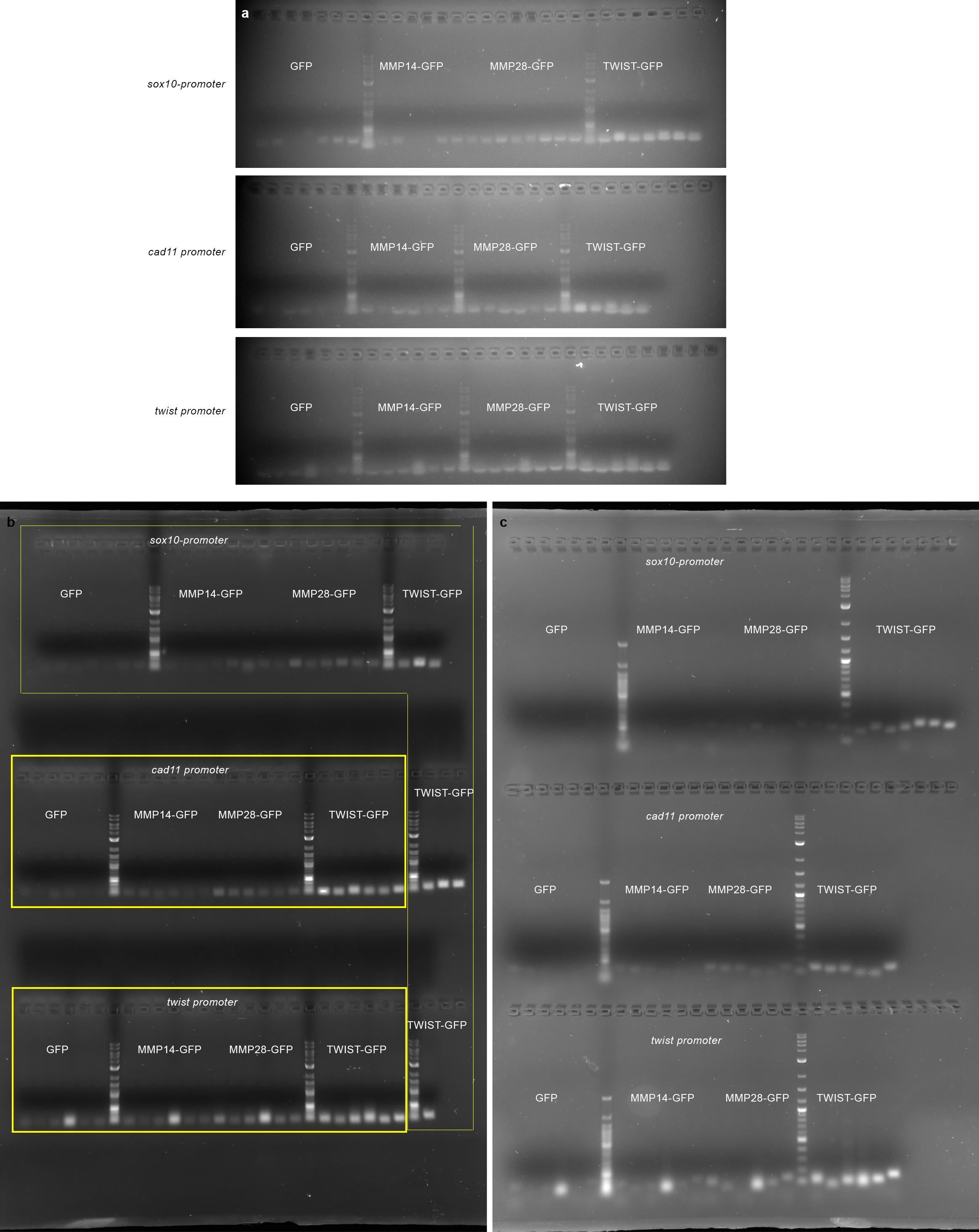 S9 Fig. PCR after chromatin immunoprecipitation with GFP, MMP14-GFP, MMP28-GFP, and Twist-GFP. |