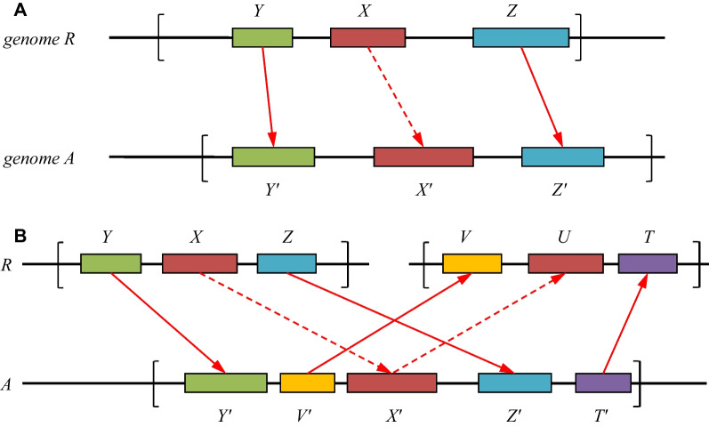 Fig. 3. The principles of orthologs search in Task I. A Forward check of a homolog X′ in species A of a given gene X in species R that involves, e.g., two witnesses: Y and Z in R and Y′ and Z′ in A. The dashed arrow represents the α-homology condition, and the solid arrow represents the β-homology (see for the explanation of α- and β-homology Step 2 in section A of Methods). The brackets indicate the chosen neighborhoods of the genes X and X′, in which the witnesses are sought. The witnesses may be arbitrarily positioned and directed within the neighborhood. B Backward check for the existence of an alternative U that is more similar to candidate X′ than X that involves, e.g., two witnesses. The dashed arrow represents the α-homology condition, and the solid arrow represents the β-homology. The brackets indicate the chosen neighborhoods of the genes X and X′, in which the witnesses are sought. The witnesses may be arbitrarily positioned and directed within the neighborhood