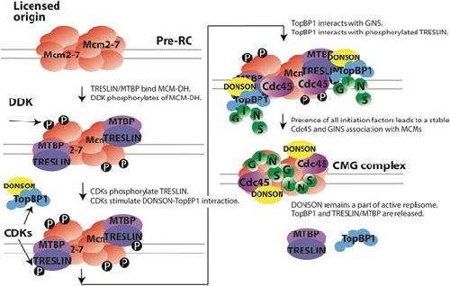 Treslin collaborates with TopBP1 in triggering the initiation of DNA replication.