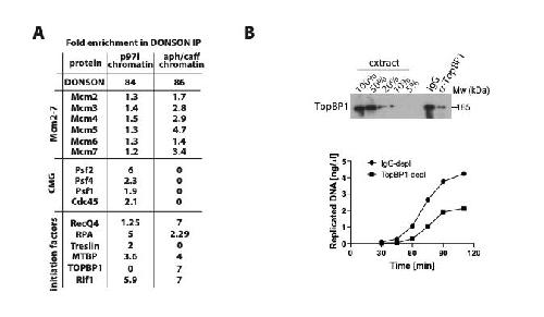 and non-specific control and DONSON(s) antibodies used for immunoprecipiatation. The fold enrichment of presented replication fators in DONSON IP over nonspecific conrol IP was coalculated and is preseneted. (B) TopBP1 was immunodepleted from egg extract. The efficiency of immunodepletion was analysed by western blotting against titration of original egg extract (top) and the ability of the immunodepleted extract to