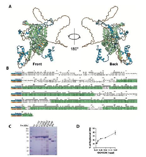 Supp Figure 3. Conservation of DONSON structure (A) AlphaFold overlay of 3D structure of Xenopus DONSON (blue) and human DONSON (orange). Overlapping structure in green. (B) Comparison of XenopusDONSON (blue) and human DONSON (orange) primary sequences. Conserved sequence in green.
