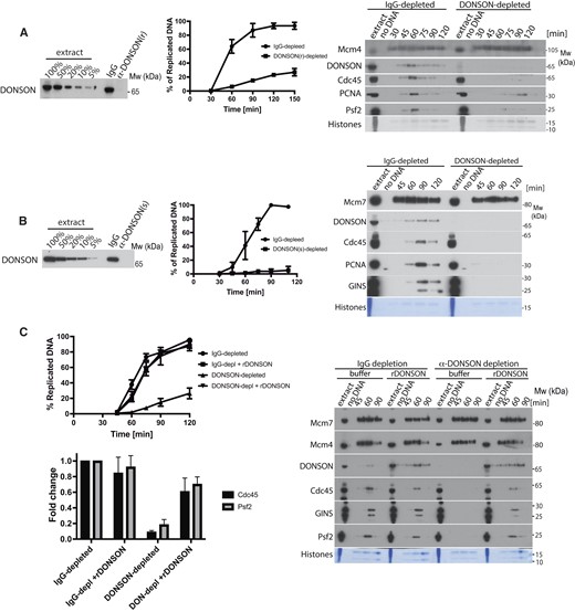Figure 2. DONSON is essential for DNA replication in X.laevis egg extract. (A, B) Xenopus egg extract was immunodepleted of DONSON using either rabbit α-DONSON antibodies (A) or sheep α-DONSON antibodies (B). Nonspecific rabbit or sheep commercial IgGs were used for control IgG– depletions. The efficiency of depletion was established by immunoblotting in comparison to titration of original extract (left). The ability of immunodepleted extracts to synthesise nascent DNA was analysed by incorporation of α32P-dATP into newly synthesised DNA (middle). Mean of n = 5 for rabbit DONSON depletion, n = 3 for sheep DONSON depletion is presented with SEM. The binding of replication fork factors in the absence of DONSON was analysed by immunoblotting of isolated chromatin fractions as in Figure 1B (right). (C) Replication reaction was set up in IgG- or DONSON-depleted extracts with optional addition of recombinant wt DONSON. The level of nascent DNA synthesis was followed as above (left top, n = 3, Mean with SEM is presented) and chromatin was isolated at indicated times and analysed by immunoblotting with indicated antibodies as in (A) (right). Quantification of fold change of chromatin bound Cdc45 and Psf2 at the peak of replication in IgG- and DONSON-depleted extract with optional addition of rDONSON over n = 3. The levels were normalised to level in IgG-depleted extract. Mean with SEM (left, bottom).