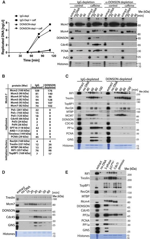 DONSON is essential for replication initiation in egg extract. (A) Replication reaction was set up in IgG- or DONSON-depleted egg extract optionally supplemented with caffeine. DNA synthesis was analysed throughout the reaction by incorporation of α32P-dATP into newly synthesised DNA (left) and chromatin bound factors analysed at indicated times with indicated antibodies (right). (B) Egg extract was immunodepleted of DONSON with rabbit antibodies as in Figure 2A, chromatin was isolated in the middle of S-phase (45 min) and whole chromatin proteome of IgG- and DONSON-depleted reaction analysed by mass spectrometry. The total spectral count of selected replication factors is presented. (C) Replication reaction was set up in IgG- or DONSON-depleted egg extract and chromatin isolated at indicated times. Chromatin bound factors were analysed by immunoblotting with indicated antibodies as in Figure 1B. (D) Replication reaction was set up in Xenopus egg extract, chromatin isolated at indicated times during early stages of replication reaction and analysed as above. (E) Replication reaction was set up in egg extract in optional presence of indicated replication initiation inhibitors. Chromatin fractions were isolated in the middle of S-phase and analysed by immunoblotting as in (A).