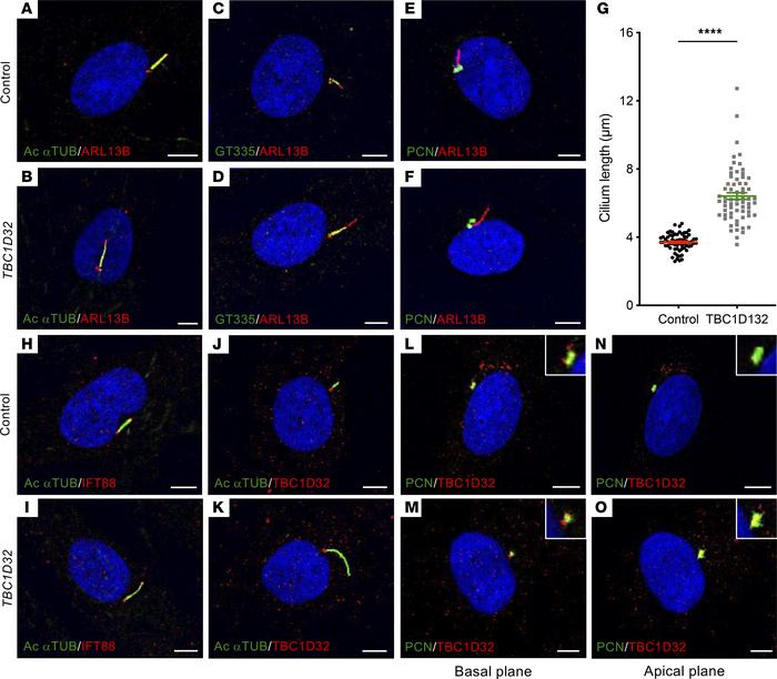 Figure 6. Morphology of the primary cilium in human fibroblasts. IF studies and single plane confocal imaging to assay ciliogenesis in control (A, C, and E) and TBC1D32 (B, D, and F) fibroblasts with antibodies directed against ARL13B and acetylated α-tubulin (Ac αTUB; A and B), GT335 (C and D), and PCN (E and F). (G) Quantification of cilium length in control and TBC1D32 fibroblasts. Data are represented as mean ± SEM; n = 66 cells; ****P < 0.0001; Student’s 2-tailed t test. IF studies to assay intraflagellar transport in control (H) and TBC1D32 (I) fibroblasts with antibodies directed against IFT88 and Ac αTUB. IF studies in control (J) and TBC1D32 (K) fibroblasts to assay the localization of TBC1D32 in relation to Ac αTUB. IF studies in control (L and N) and TBC1D32 (M and O) fibroblasts to assay the localization of TBC1D32 in relation to PCN in a basal (L and M) and apical (N and O) plane. Insets show a 2-fold magnification of the labeled basal bodies/centrosomes in each panel. Scale bars = 5 μm. |