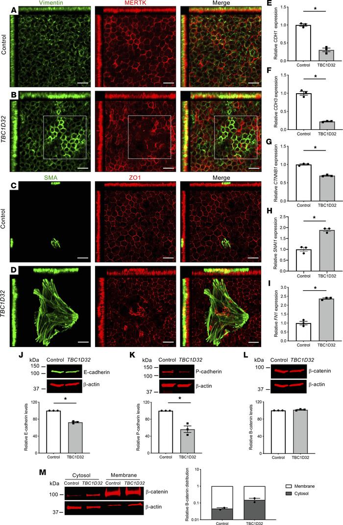 Figure 8. EMT-like phenotype in human TBC1D32 iPSC-derived RPE. IF studies and MIP confocal imaging of control (A) and TBC1D32 (B) iPSC-derived RPE using antibodies directed against vimentin and MERTK. The boxed area in B indicates areas of upregulated vimentin and disrupted MERTK expression. Scale bars = 20 µm. IF studies and MIP confocal imaging of control (C) and TBC1D32 (D) iPSC-derived RPE using antibodies directed against SMA and ZO1. Scale bars = 20 μm. qPCR analysis of CDH1 (E), CDH3 (F), CTNNB1 (G), SNAI1 (H), and FN1 (I) in control and TBC1D32 RPE. Data are represented as mean ± SEM; n = 3 technical replicates; *P < 0.05; 2-tailed Mann-Whitney test. Representative Western blot analysis of E-cadherin (J), P-cadherin (K), and β-catenin (L) expression and quantification relative to the β-actin loading control; the same membrane was hybridized with 2 different primary antibodies in panels J and L. Data represented as mean ± SEM; n = 3 blots; *P < 0.05; 2-tailed Mann-Whitney test. (M) Representative Western blot analysis and quantification of 2 independent blots of β-catenin distribution in the cytosol versus membrane fractions of control and TBC1D32 iPSC-derived RPE relative to the β-actin loading control and displayed on a logarithmic scale. Data are represented as mean ± SEM. |