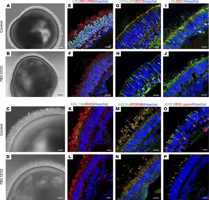 Figure 10. Morphology of human iPSC-derived retinal organoids. Brightfield microscopy of control (A) and TBC1D32 (B) retinal organoids at day 225 of differentiation showing the brush border. Scale bars = 100 μm. Higher magnification of the ONL of control (C) and TBC1D32 (D) organoids. Scale bars = 50 μm. IF studies and MIP confocal imaging of control (E, G, and I) and TBC1D32 (F, H, and J) organoids with antibodies directed to CRX and RCVRN (E and F) to assay general photoreceptor morphology, CRALBP and ZO1 to assay the OLM (G and H), and RK and ZO1 to assay the prolongation of the IS and OS (I and J). IF studies of control (K, M, and O) and TBC1D32 (L, N, and P) organoids with antibodies directed to ARL13B and RHO (K and L) to assay the CC and prolongation of the OS, ABCA4, and PDE6B (M and N) to assay the OS of rods and/or cones, and ARR3 and R/G opsin (O and P) to assay the cones. All nuclei are labeled with Hoechst. Scale bars = 20 μm. |