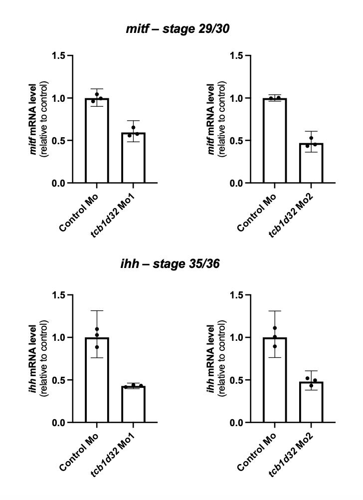 Supplemental Figure 8. Xenopus RPE marker expression following tbc1d32 knockdown. qPCR analysis of mitf and ihh expression, in optic vesicles at stage 29-30 and whole eyes at stage 35-36, respectively, injected with control Mo, tbc1d32 Mo1 or tbc1d32 Mo2 (15ng). Data are represented as geometric mean with 95% CI; n = 3 technical replicates. |
