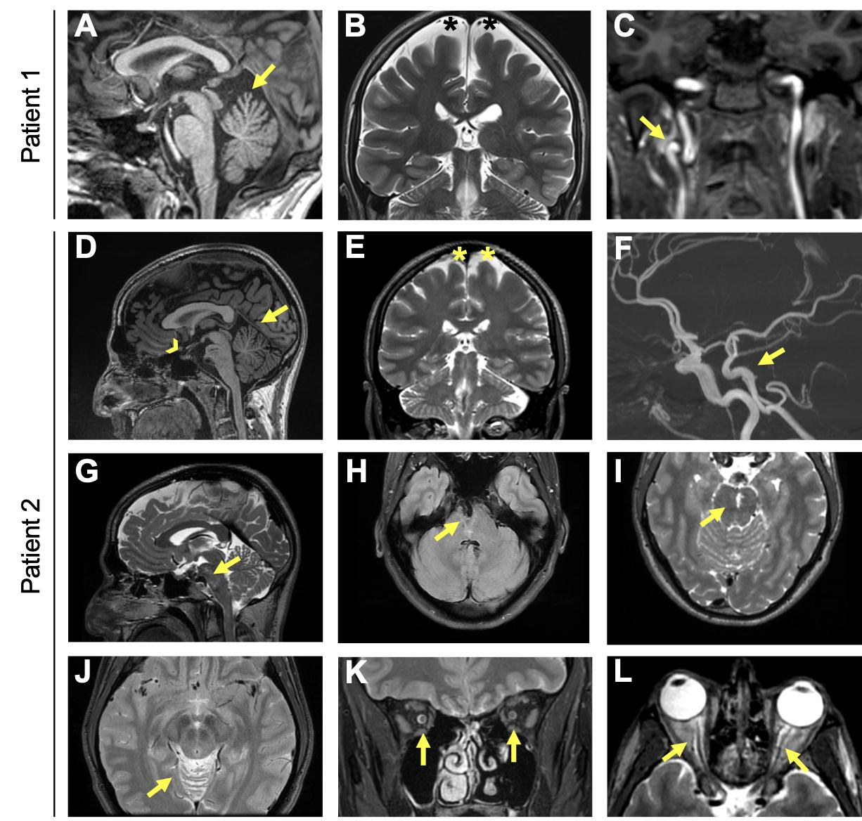 Supplemental Figure 2. Cerebral MRI of Patients 1 and 2. A) Sagittal T1 weighted MRI images showing cerebellar atrophy involving specifically the superior part of the cerebellar vermis (arrow). The pituitary gland is normal both for the anterior and the posterior part. B) Coronal T2 weighted images showing diffuse widened subarachnoid spaces suggesting mild cerebral atrophy (black asterisks). C) Coronal T1 weighted imaging showing loop of the cervical segment of the right internal carotid artery, which is an unusual finding in young adults (arrow). D) Sagittal T1-weighted images showing cerebellar atrophy involving specifically the superior part of the cerebellar vermis (arrow). The pituitary gland is normal both for the anterior and the posterior part (arrowhead). E) Coronal T2 weighted images showing diffuse widened subarachnoid spaces suggesting mild cerebral atrophy (asterisks). F) 3D Time of Flight images showing the dolichoectasia of the basilar artery (arrow). G) Sagittal T2 weighted images showing the slight brainstem compression (arrow). H) Axial Fluid Attenuated Inversion Recovery T2 weighted images showing the dolichoectasic basilar trunk in a mid- pons cleft (arrow). I) Axial T2 weighted images showing stretched enlarged perivascular spaces in the mid-pons (arrow). J) Axial T2 weighted images showing the atrophic superior vermis (arrow). Coronal (K) and axial (L) T2 weighted images showing bilaterally enlarged perioptic fluid space in the intraconic and pre-bulbar tracts (arrows). |