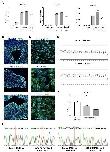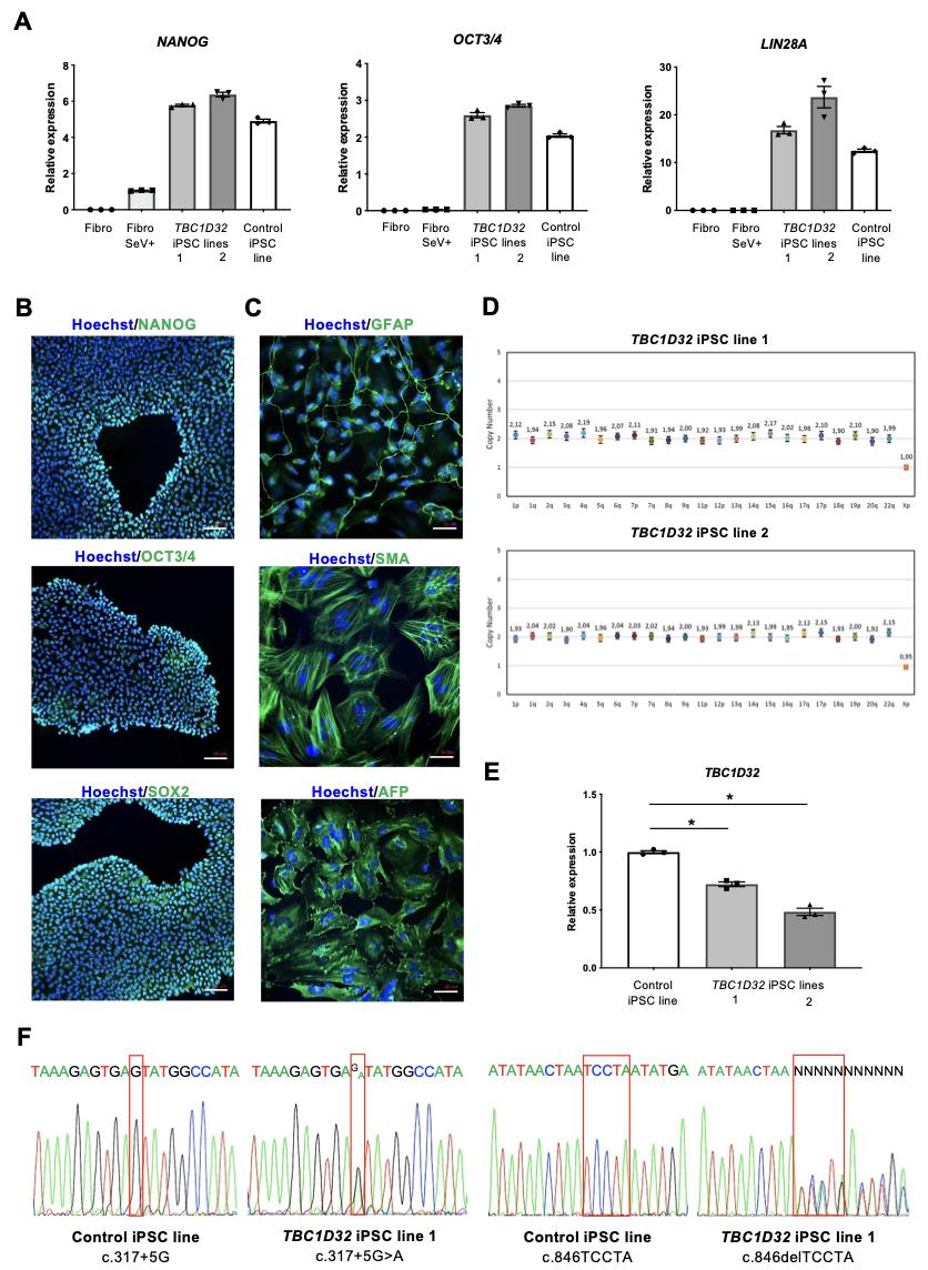 Supplemental Figure 12. Quality controls of TBC1D32 iPSC lines from Patient 1. A) qPCR analysis of the pluripotency markers NANOG, OCT3/4 and LIN28A in fibroblasts, fibroblasts transduced with Sendai reprogramming vectors (Fibro SeV+; light grey bars), TBC1D32 iPSC lines 1 and 2 (dark grey bars), and a control iPSC line (black bars). Data are represented as mean ± SEM. B) IF analysis of the pluripotency markers NANOG, OCT3/4 and SOX2 (in green; nuclei labelled in blue) in TBC1D32 iPSC line 1. Scale bars = 70 μm. C) IF analysis of the germline markers glial fibrillary acidic protein (GFAP; ectoderm), smooth muscle actin (SMA; mesoderm) and alpha-fetoprotein (AFP; endoderm), following EB differentiation of TBC1D32 iPSC line 2. Scale bars = 40 μm. D) Digital qPCR analysis of rearrangement hotspots in TBC1D32 iPSC lines showing a copy number of 2 for all autosomal regions, and a copy number of 1 for the X chromosome. E) qPCR analysis of TBC1D32 expression in TBC1D32 iPSC lines (grey bars) in comparison to a control line (black bar). Data are represented as mean ± SEM; n = 3 technical replicates; p<0.05; Mann and Whitney. F) Sanger sequencing of the regions carrying the variants c.317+5G>A and c.846delTCCTA (red boxes) in the TBC1D32 iPSC line 1 in comparison to a control iPSC line. |