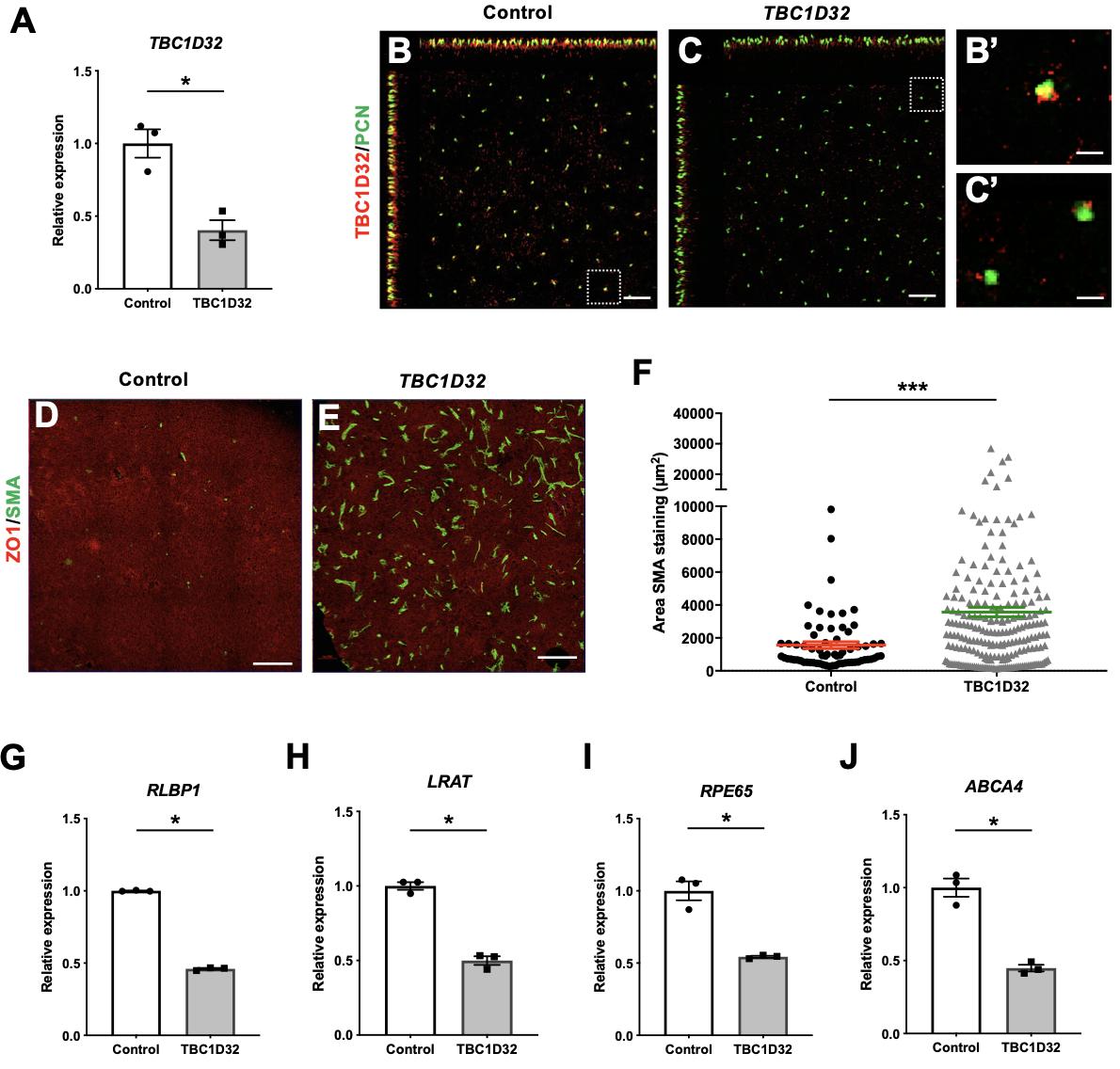 Supplemental Figure 13. Expression of TBC1D32 and EMT and visual cycle markers in iPSC-derived RPE. A) qPCR analysis of TBC1CD32 expression in control (black bar) and patient (grey bar) iPSC-derived RPE. Data are represented as mean ± SEM; n = 3 technical replicates; p<0.05; Mann and Whitney. IF studies and MIP confocal imaging of TBC1D32 and PCN expression in control (B) and TBC1D32 (C) iPSC-derived RPE. Scale bars = 10 μm B’, C’) Higher magnification of the boxed cells shown in B (scale bar = 2 μm) and C (scale bar = 2.5 μm), respectively. D) A 16 field-montage of a transwell filter of control (D) and TBC1D32 (E) iPSC-derived RPE immunolabelled for ZO1 and SMA. Scale bars = 50 μm. F) Scatter plot represents the quantification of each area of SMA staining in control (n = 67) and TBC1D32 (n = 230) iPSC-derived RPE shown in D and E. Data are represented as mean ± SEM; ***p<0.0005; Student’s t-test. qPCR analysis of the visual cycle markers RLBP1 (G), LRAT (H), RPE65 (I) and ABCA4 (J) in control (black bar) and patient (grey bar) iPSC-derived RPE. Data are represented as mean ± SEM; n = 3 technical replicates; *p<0.05; Mann and Whitney. |
