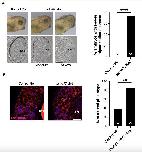 Supplemental Figure 6. Xenopus RPE phenotype in tbc1d32 Mo2 injected embryos. A) Upper panels, lateral views of the head of one control and two morphant embryos with moderate and severe phenotypes (anterior to the right). Lower panels, transverse retinal sections of control and morphant embryos (dorsal side up). The histogram represents the percentage of embryos with a severe decrease in pigmentation among control (control Mo), and morphant (tbc1d32 Mo2) groups. B) Phalloidin staining of filamentous actin on dissected eyes of control or Mo2 morphant Xenopus embryos at stage 35-36. The total number of embryos analyzed per condition is indicated in each bar. ****p<0.0001, **p<0.01; Fishers exact test. Scale bars = 400 um for whole mounts, 60 um for sections in A, and 20 m in B. |