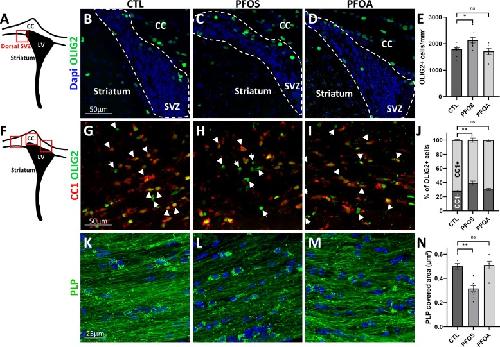 Fig. 2. . Perinatal exposure to PFOS, but not PFOA, increased the generation of SVZ-derived oligodendrocyte precursor cells (OPCs), which were not able to maturate into myelin-forming oligodendrocytes. A, F) Schematic drawing showing on coronal sections of p21 pups level illustrated in B-D for subventricular zone and in G-I and K-M for corpus callosum exposed to either PFOS, PFOA or control (CTL). B-E) section at the level of the SVZ immunostained for OLIG2 (green in B-D), at the level of the corpus callosum doubly stained for OLIG2 (green) and CC1 (red in G-I), and with anti-PLP to stain myelinated fibers (K-M) above the lateral ventricles. Note for PFOS exposed animals the increased density of OPC-OLIG2+ cells (C, E) contrasting with the lower ratio of mature oligodendrocytes OLIG2+/CC1+ (H, I) and the lower myelin staining (PLP+ ) in (L, N). In contrast, in brain sections of PFOA exposed animals, no significative differences compared to controls were observed. Nuclei are counterstained with DAPI; CC = corpus callosum, SVZ = subventricular zone, LV = lateral ventricles. Scale bar: B, C, D, F, G, H = 50 m; K, L, M = 25 m. (For interpretation of the references to colour in this figure legend, the reader is referred to the web version of this article.)