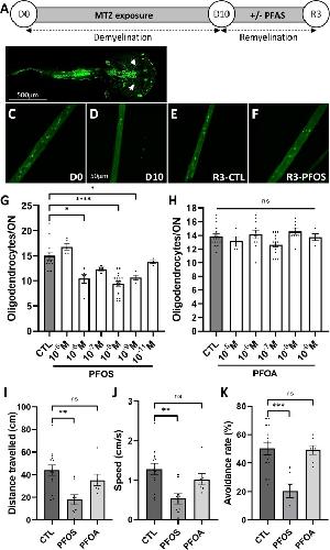 Fig. 4. In vivo PFOS inhibited remyelination. (A) Flow chart showing the sequence of events tested. (B) Whole mount of Tg(Mbp:GFP-ntr) Xenopus laevis (stage 50 tadpoles) showing GFP expression in the brain, optic nerve (white arrows) and spinal cord. At this magnification GFP+ oligodendrocyte cell bodies are not visible. (C-F) Higher magnification of Tg(Mbp:GFP-ntr) Xenopus laevis optic nerve before (D0)(C), at the end of metronidazole-induced demyelination (D10)(D) and after 3 days (R3) of spontaneous recovery in control (E) or PFOS exposed tadpoles (F); scale bar in B = 500 m in C-F = 50 m. (G, H) Dose response of remyelination after addition for 3 days of either PFOS (G) or PFOA (H). Remyelination was evaluated by counting the number of GFP + oligodendrocytes per optic nerve. Note the non-monotonic inhibition of remyelination following PFOS exposure, while PFOA had no effect. (I-K) PFOS inhibition of remyelination affected tadpoles behavior as assayed by distance traveled (I), speed of swimming (J) and visual avoidance of a virtual collision (K) contrasting with the absence of effect of PFOA.